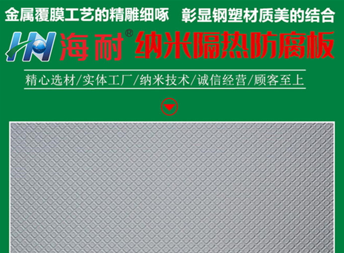 海耐納米隔熱彩鋁板是一種復(fù)合金屬板,包括金屬基板、高分子轉(zhuǎn)化層、光譜選擇性反射隔熱層、納米材料層(高耐候、耐酸堿保護(hù)層);由于它耐候性好、耐酸堿、防腐蝕、隔熱、降噪、防火發(fā)揮不同組元材料的力學(xué)、化學(xué)、物理等綜合性能,在現(xiàn)代建筑中獲得廣泛應(yīng)用。具體優(yōu)點(diǎn)如下:1、任意造型:可為建筑師提供無(wú)限創(chuàng)意空間,建造美麗獨(dú)特的建筑、創(chuàng)造完滿的視覺效果。2、安全可靠:所有部件均采用鋼性連接,可抗強(qiáng)臺(tái)風(fēng)襲擊。3、重量輕便:對(duì)鋼構(gòu)的承重要求降低,施工難度小。4、易安裝:安裝方便,縮短施工周期,節(jié)約工程造價(jià)。5、隔熱效果好:高熱反射率使產(chǎn)品表面不吸熱,即使在夏天板面也不燙手,使建筑物內(nèi)溫度降6-8度。昂貴和便宜是相對(duì)的。這取決于什么樣的產(chǎn)品,(咨詢:0510-83326008)