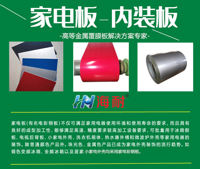 海耐家電彩鋼板是以熱鍍鋅鋼板、鍍鋁鋅鋼板、電鍍鋅板等為基板,經(jīng)表面化學轉(zhuǎn)化預處理之后,在表面熱帖一層或幾層的高分子膜,隨后經(jīng)過冷卻粘合固化而成的產(chǎn)品。也因覆有各種不同顏色的膜由此得名,也稱彩鋁板(卷)。使用熱鍍鋅鋼板為基材的海耐家電彩鋼板、覆膜鋼板除有鋅層保護外,鋅層上的高分子膜起了覆蓋和保護作用,防止金屬基板生銹,使用壽命是傳統(tǒng)金屬板或彩涂板的約2-3倍。海耐家電彩鋼板(咨詢:0510-83326008)具有輕質(zhì)、美觀和良好的防腐蝕性能,又可直接加工,顏色一般分為灰白、海藍、磚紅,灰色、木紋、石紋、拉絲板主要應用于廣告業(yè)、建筑業(yè)、家電行業(yè)、電器行業(yè)、家具行業(yè)及化工容器罐體。海耐家電彩鋼板所用納米膜根據(jù)使用環(huán)境不同和客戶需求選擇合適的的材料,用戶可根據(jù)自身用途進行針對性選擇表面膜的材質(zhì)。